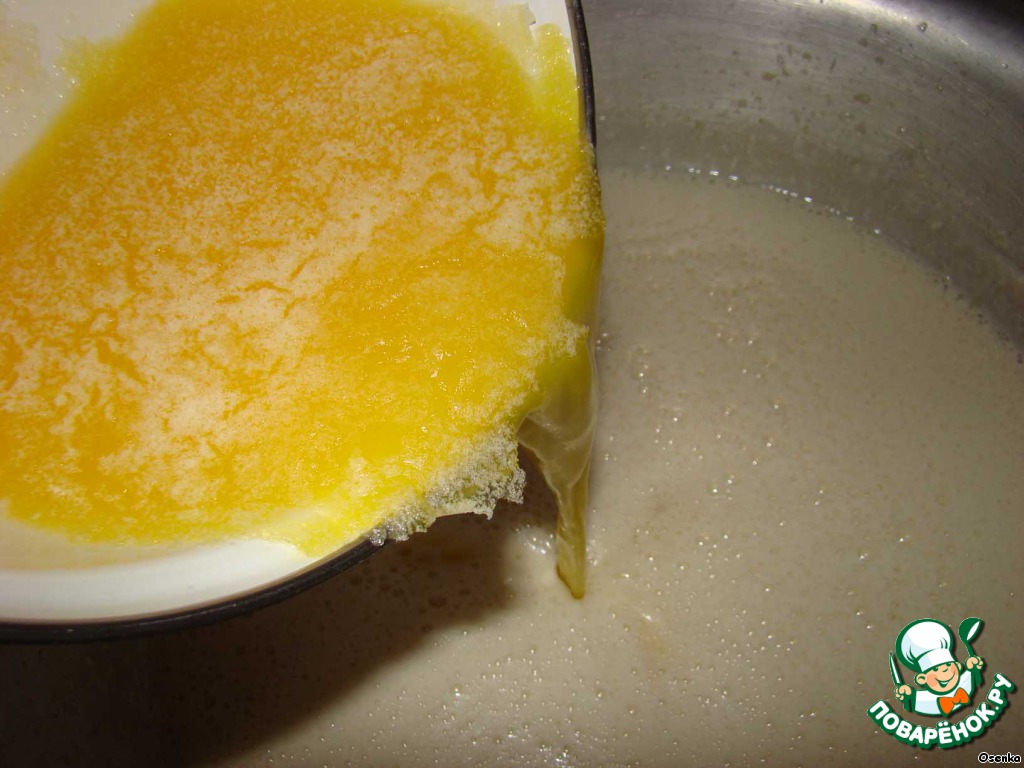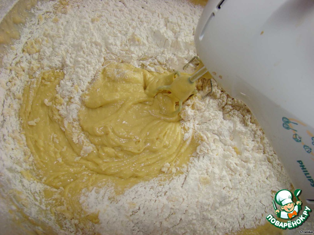 Затем порциями добавить 6 стаканов муки, чередуя с маслом.