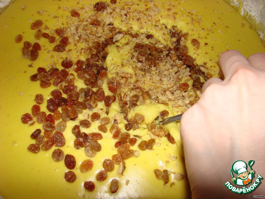 Когда тесто подойдёт в 2 раза, добавить запаренный изюм и орехи (по желанию).