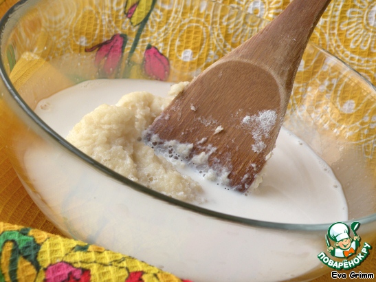 Автор предлагает брать 0,5 стакана кипящего молока и заварить около половины стакана муки, деревянной ложкой быстро вымесить тесто. Но я советую молока взять больше, иначе заварное тесто будет очень плотным и размешать с остальными продуктами будет сложно.