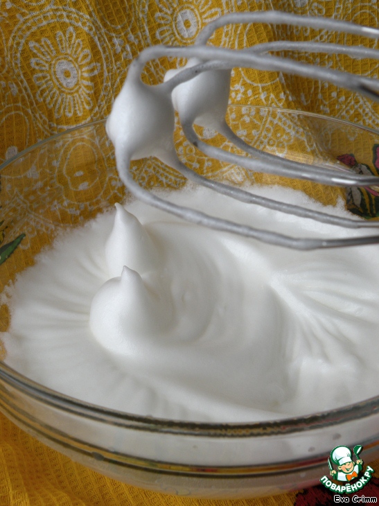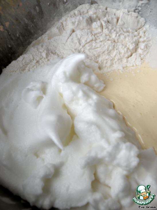 В готовую опару вмешиваем всю белковую массу и половину сахарно-яичной, 1,5 стакана муки, хорошо вымешать (я это делала миксером, сначала на малой скорости, потом увеличила). Ставим отдыхать тесто еще на час в тепло, накрыв полотенцем.
