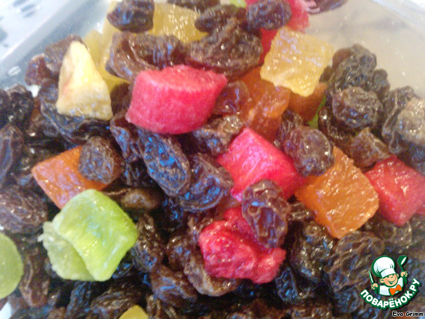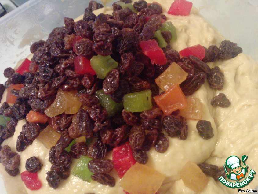 Изюм и цукаты промыть, залить коньяком... пусть стоят...