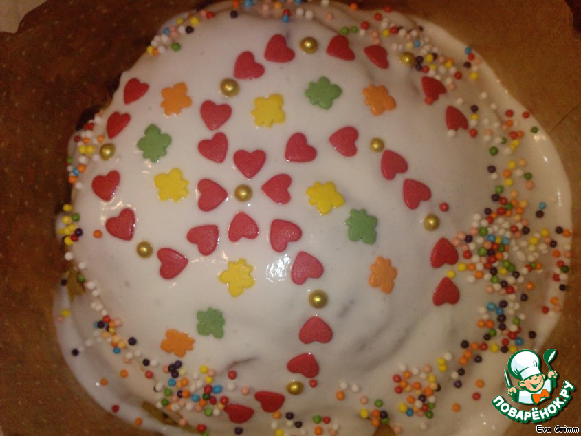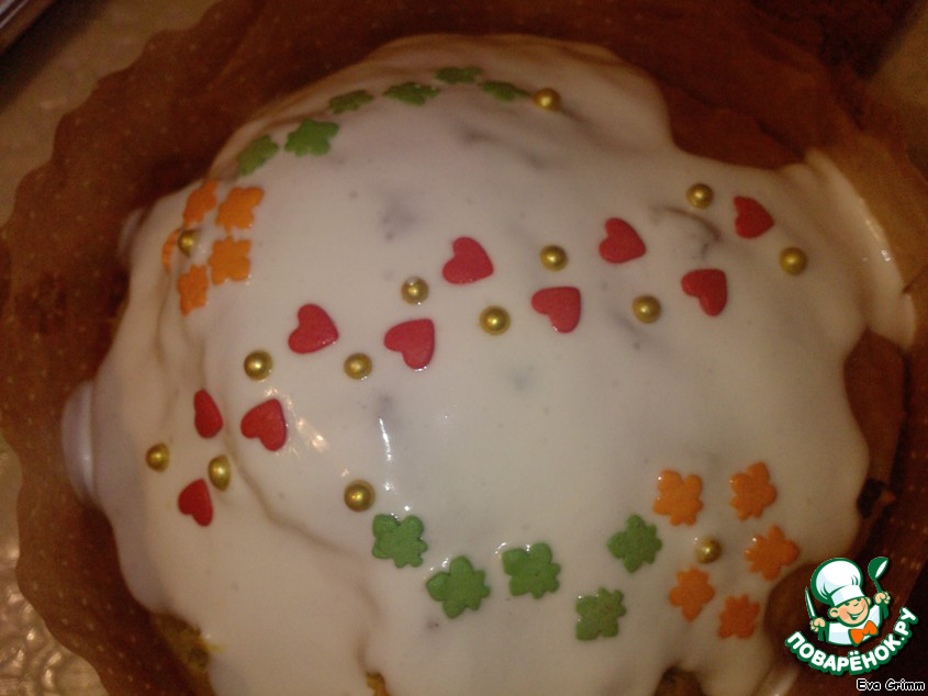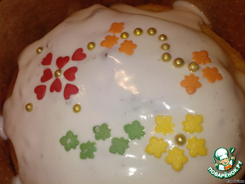 Белок от 2-х яиц взбиваем с добавлением лимонного сока и сахарной пудры до состояния густой сметаны. :-P Это глазурь... Ей покрываем куличи... И перекладываем наши цветы на глазурь..
