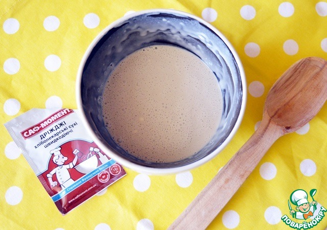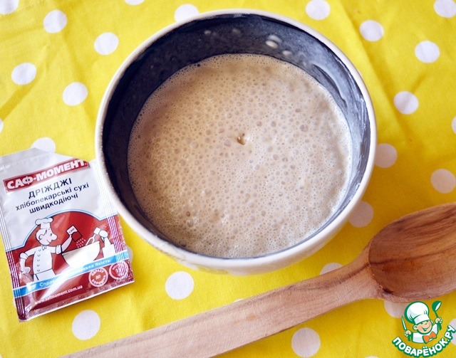 Первым делом приготовим нашу опару. Дрожжи САФ-МОМЕНТ заливаем теплой водой и очень хорошо перетираем деревянной ложечкой до однородности, чтобы не оставалось комочков! Вмешиваем 1 ст. л. муки, накрываем крышечкой или салфеточкой нашу опару и убираем в теплое место без сквозняков на 20 минут, чтобы образовалась "шапочка"