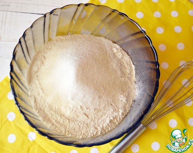Тем временем просеиваем муку и хорошо перемешиваем ее венчиком с сахаром, солью и ванильным сахаром.