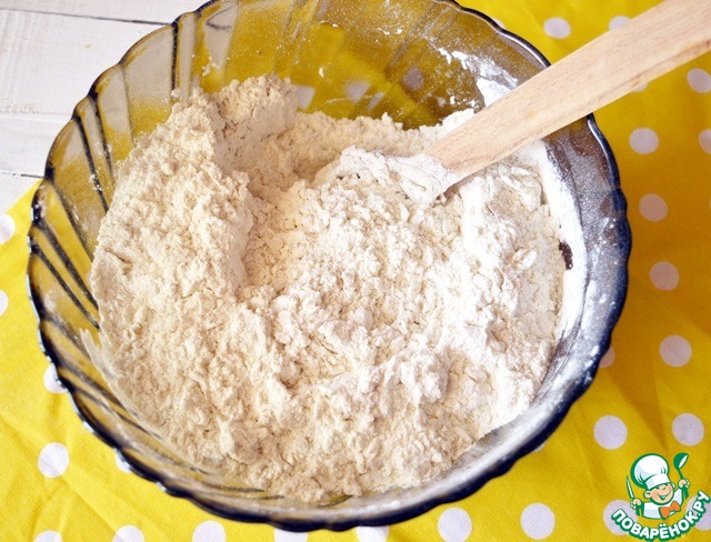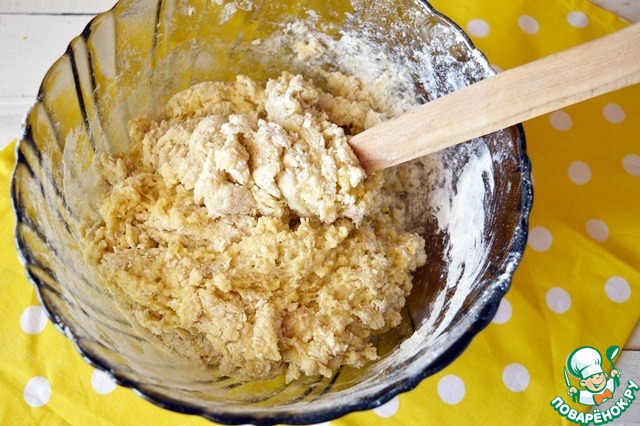 Очень бережно перекладываем их в мучную смесь и перетираем деревянной ложечкой до однородной крошки