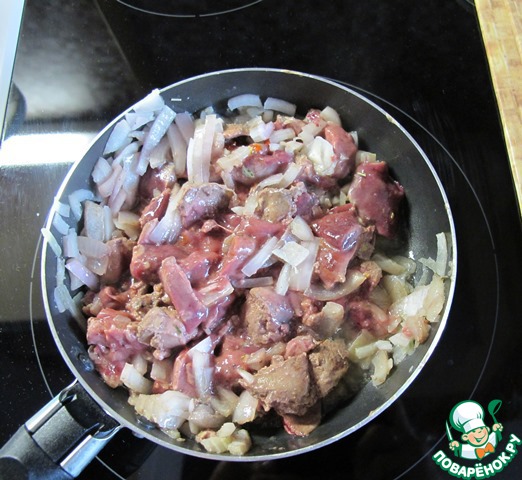 Репчатый лук нашинковать и обжарить с печенью до полуготовности. Посолить и посыпать специями.
