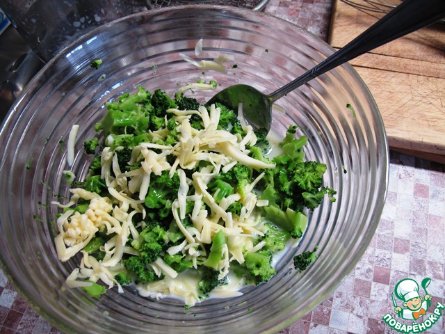 Замороженную брокколи только бланшировать. Свежую брокколи слегка отварить. Остудить и порезать. Взбить 2 яйца с двумя ложками сметаны или сливок и залить брокколи. Добавить половину натертого сыра, слегка посолить.