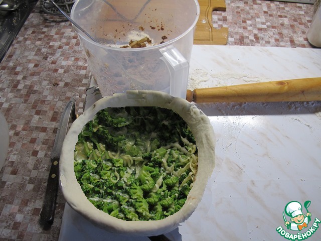 Затем начинаем заполнять начинкой. Слой жареной печени, слой брокколи, слой печени с сыром. Верх закрываем еще одним кружком теста и очень аккуратно защипываем края. В "крышечке" делаем небольшое отверстие, чтобы выходил пар.