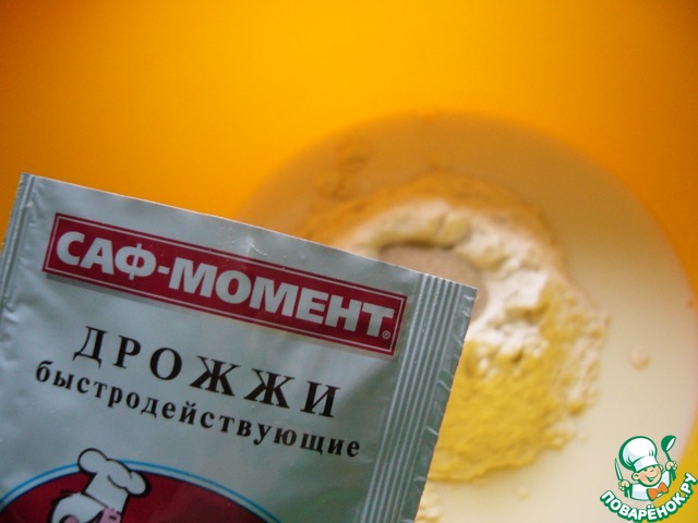 Приготовить опару-в чуть тёплое молоко всыпать 100 г просеянной муки. Добавить сухие дрожжи ТМ"Саф-момент"