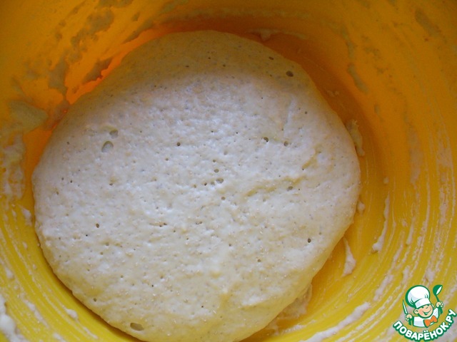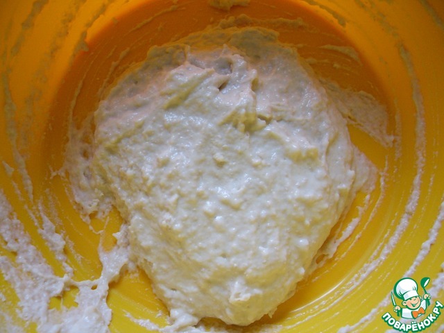 Замесить жидковатое тесто. Накрыть полотенцем и поставить в тёплое место (я ставила около батареи на 30 минут)