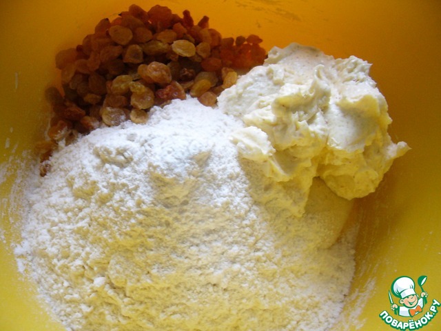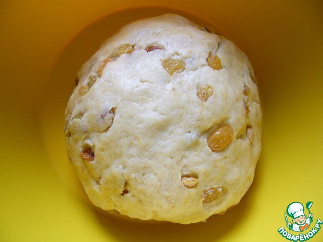 В готовую опару выложить масляную смесь, добавить изюм и всыпать оставшуюся (250г) просеянную муку.