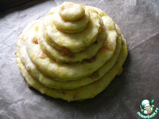 Выложить все круги в виде пирамиды на противень, застеленный бумагой для выпечки и смазанный маслом. Накрыть полотенцем и убрать в тёплое место на 20-30 минут