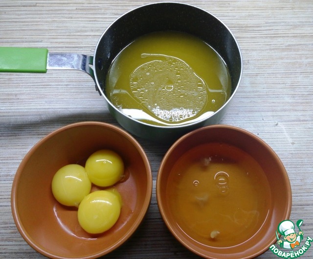 Желтки отделить от белков. Сливочное масло растопить, растворить в нем оставшийся сахар и оставить остывать.