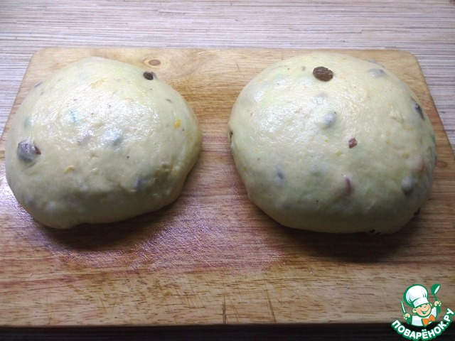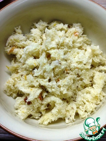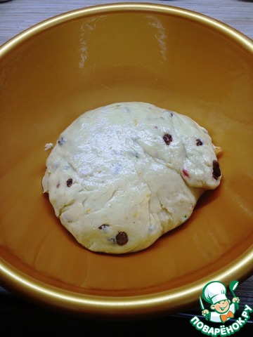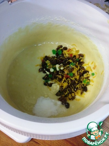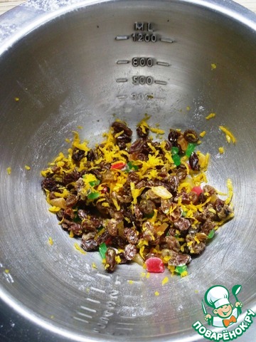 Изюм замочить в кипятке на 10-15 мин, после изюм отжать, слегка обсушить на бумажном полотенце. Переложить изюм в миску, добавить туда же ананас, можно любые сухофрукты или цукаты, лимонную цедру и чайную ложку муки. Перемешать.
