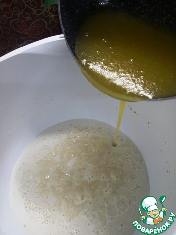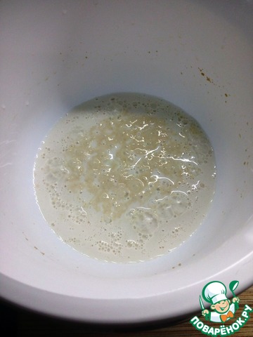 В теплое молоко добавить 1 ч. л. сахара и дрожжи, перемешать и отставить в сторону до появления шапочки пены.