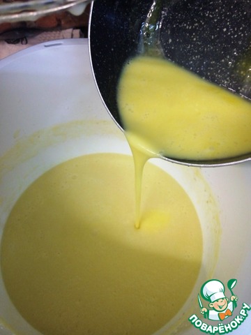Затем добавить слегка взбитые яйца (3 желтка+2 яйца)