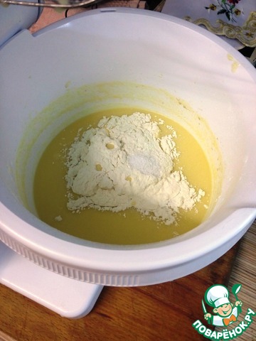 После добавить половину муки (360 гр) и соль, хорошенько вымешать