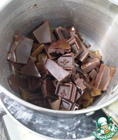 Горький и молочный шоколад растопим на водяной бане, добавляем туда коньяк или ликер (по желанию) и сливки. Хорошенько размешиваем до однородности