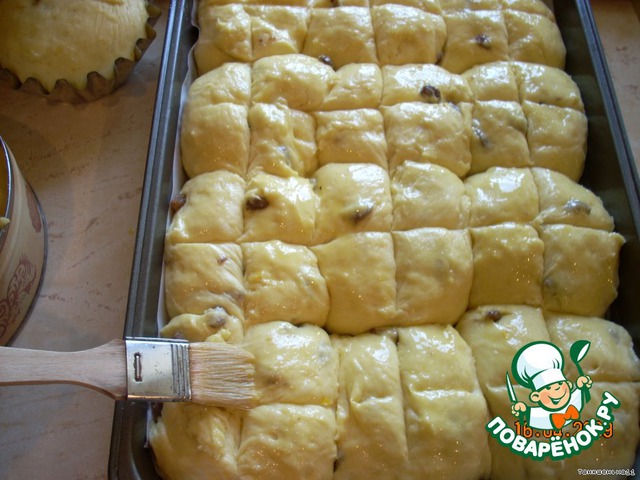 Тесто для булочек должно быть чуть гуще, добавить немного муки. Формируем булки, оставляем в теплом месте на1-1,5 ч. После обратной стороной ножа делаем крестообразные надрезы. Смазываем яйцом и выпекаем при 180 градусах, 40-60 мин., взависимости от величины формы и массы теста в ней.