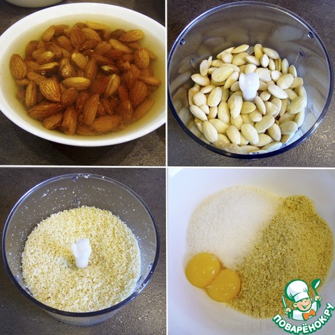 Пока тесто настаиваться займемся первой начинкой. Миндаль залить кипятком, оставить на 5 минут. После этого его будет очень легко очистить от кожуры. Просушить от остатков воды при помощи полотенца, затем перемолоть в крошку при помощи блендера. Добавить сахар, ванильный сахар и 2 желтка.