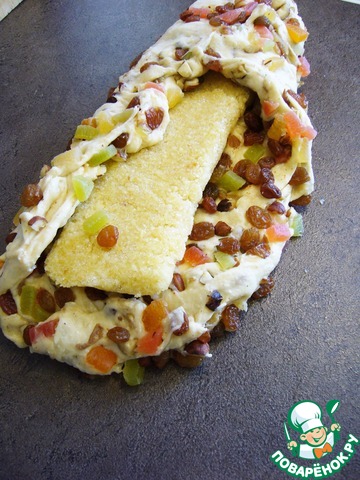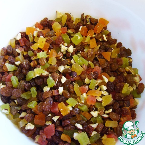 Изюм залить кипятком на 10 минут, просушить, добавить нарезанные цукаты и орехи.