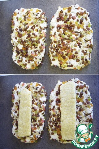 В подошедшее тесто вмешаем обсушенные сухофрукты и орешки. Разделить тесто на равные две части. И в центр каждого теста положить миндальную начинку.