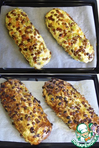 Выложить на застланный пергаментом противень тесто швом вниз и оставляем на расстойку, минут на 20. Смазать желтками и выпекать в заранее разогретой духовке при 180гр. 30-40 минут до золотистой корочки.