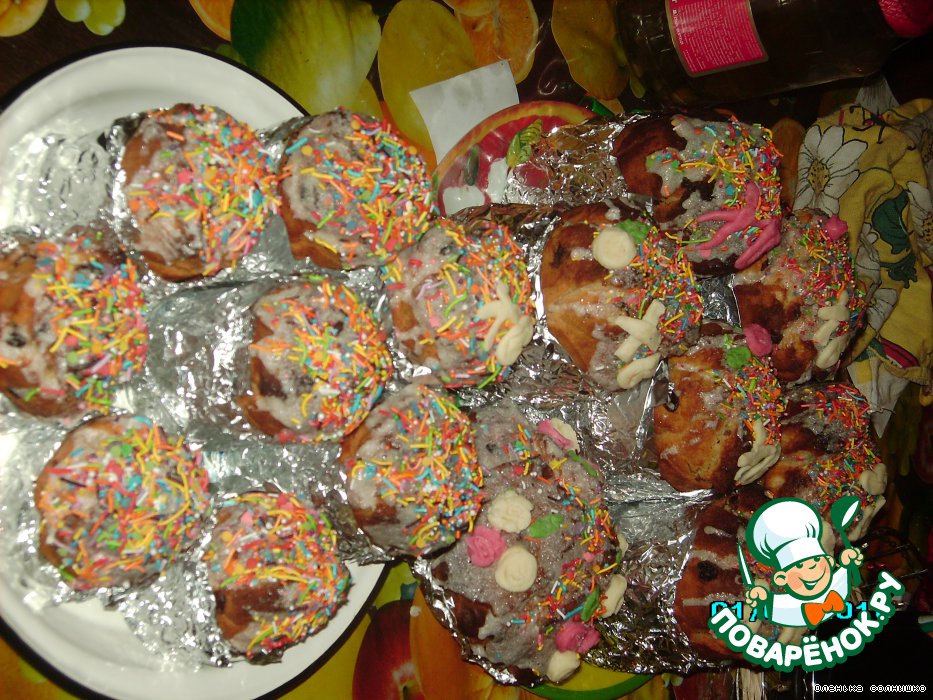 10. Немного остывшие куличи можно украшать: смешать в мисочке кисточкой белок, сахар и сухое молоко; посыпать кондитерской присыпкой, розочки и т. п. я лепила из мастики по рецепту поваренка Подсолнушек.
