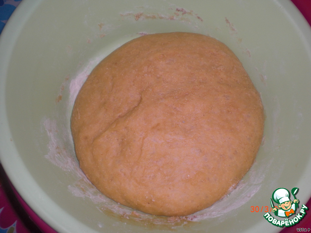 Из молока, дрожжей и немножко муки делаем опару. Масло взбиваем с мёдом и сахаром, добавляем подошедшую опару, 2 яйца и остальные продукты. Замешиваем тесто и оставляем для поднятия в два раза.