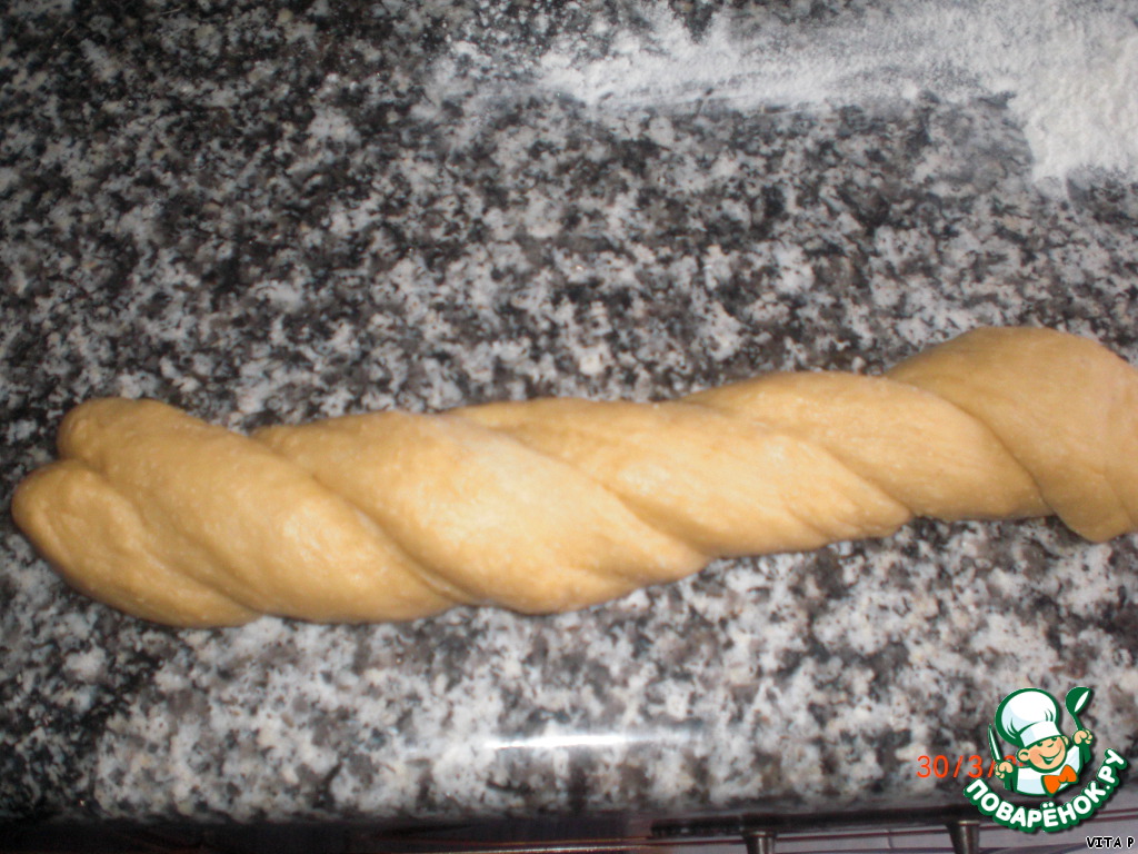 Края жгута соединяем - получается небольшой калач, в середину кладём вареное неочищенное яйцо, из маленького кусочка делаем две тонкие колбаски и укладываем крестом на яйцо, оставляем минут на 15 для поднятия. Духовку греем до 180 градусов, куличи смазываем желтком и отправляем в духовку минут на 40.
