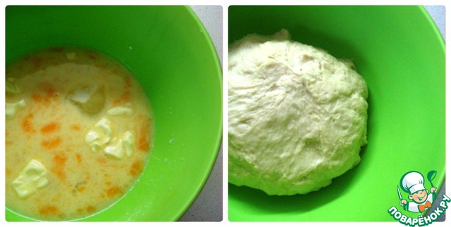 Подогреваем молоко, чтобы оно было теплым. Растоворяем в молоке дрожжи, добавляем сахар, щепотку соли, яйцо, масло комнатной тепературы. Просеиваем муку. Добавляем и замешиваем мягкое тесто. Ставим его в теплое место подходить (у меня тесто подошло примерно за 1 час).