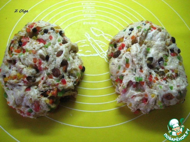 Пока мы занимались начинкой, наше тесто чудесным образом подошло, за что ему большое спасибо! Аккуратно вмешиваем в тесто наши цукаты+сухофрукты.
