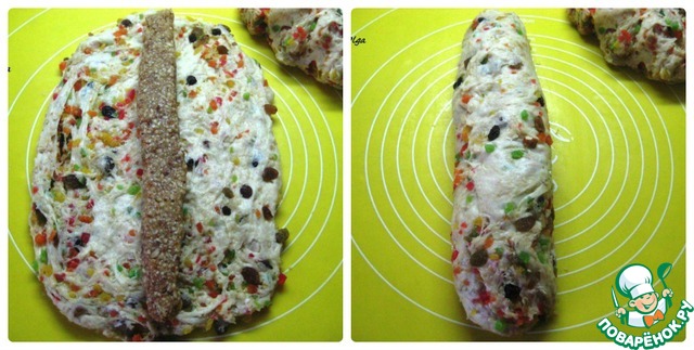В центр лепешки кладем миндальную колбаску (или готовый марципан). Аккуратно защипываем края и формируем "батон".