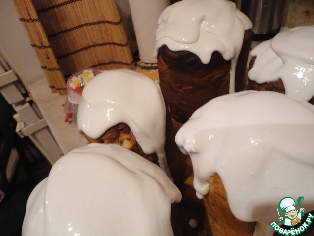 А вот глазури готовила "полную" порцию. Белков-то, мягко говоря, много осталось. Так что куличи я глазурью покрыла ну более чем щедро!