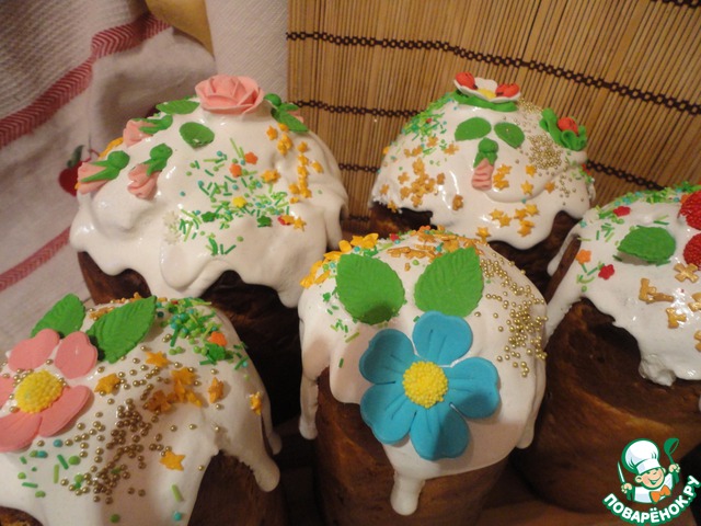Кроме глазури, я украшала куличи готовыми марципановыми цветами и цветной посыпкой.