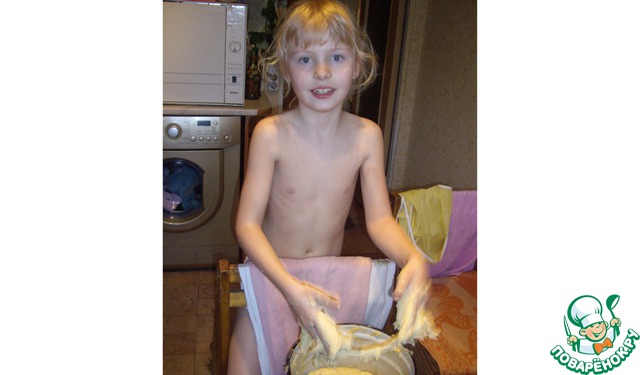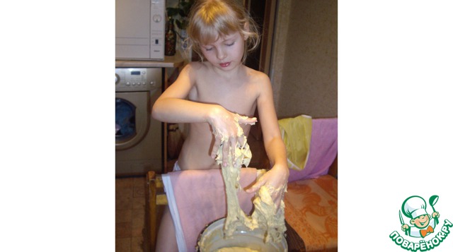 Снова начать вымешивать, понемногу добавляя растопленное масло. Месить нужно минут 40. Этот процесс можно поручить детям.