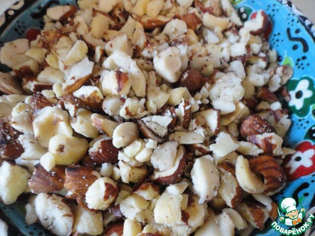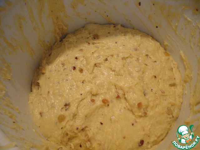 Добавить изюм и орехи. У меня была смесь фундука, миндаля и кешью. Я орехи слегка поджарила на сухой сковороде и без фанатизма измельчила в ступке.