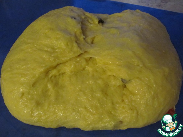 Обминаем тесто и вмешиваем изюм (предварительно я его залила коньяком на 5 часов). Изюм высыпаем на сито, просушиваем слегка и смешиваем с мукой, потом уже вмешиваем руками в тесто!