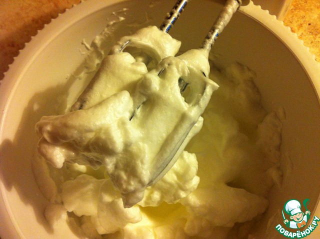 Берем 5 средних яиц весом примерно по 60 г каждое и отделяем белки от желтков. Белки взбиваем до состояния устойчивых мягких пиков.