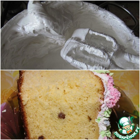 Чтобы украсить верх куличей, готовлю белковый крем. Беру белки, взбиваю до мягких пиков. Ставлю на кипящую паровую баню, добавляю в белок сахар и продолжаю взбивать при равномерном кипении воды. Сигналом о готовности крема служит то, что крем собирается по стенкам кастрюли, середина пустая, крем густой! Примерно уходить от 10 до 15 минут (зависит от мощности миксера и интенсивности кипения!). Как только крем готов - перекладываю в кондитерский мешок и начинаем украшать куличики. А вот разрезик кулича: