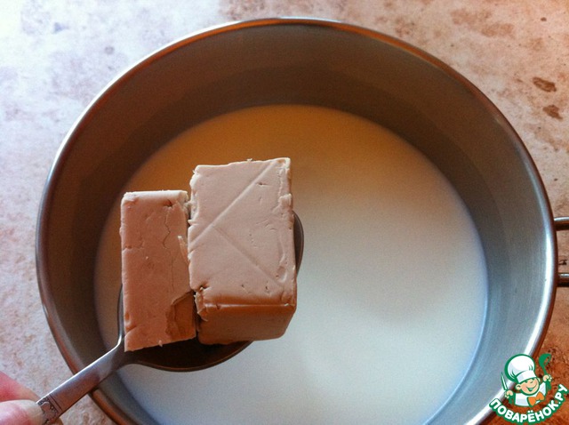 Для приготовления опары подогреваем 350 мл молока до теплого состояния и разводим в нем 60 г дрожжей. Дрожжи берем только "живые", не экстра класса! Нам не нужно быстрое вызревание опары!