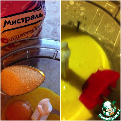 В желтки засыпаем 400 г мелкого сахара от Мистраль и тщательно перетираем при помощи блендера.