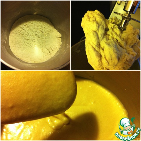 Заблаговременно согреваем 250 г сливочного масла жирности 72% при комнатной температуре, добавляем к нему 50 мл горчичного масла, оно придаст приятный желтый цвет выпечке и приятный аромат! Просеиваем 500 г муки, добавляем молочно-дрожжевую смесь и замешиваем тесто, будет густое. Добавляем соль, сахарно-яичную смесь, взбитые белки, сливочное и горчичное масло и тщательно вымешиваем до однородного состояния. Я эти манипуляции проводила кухонной машиной сначала К-образной насадкой, затем - крюк.