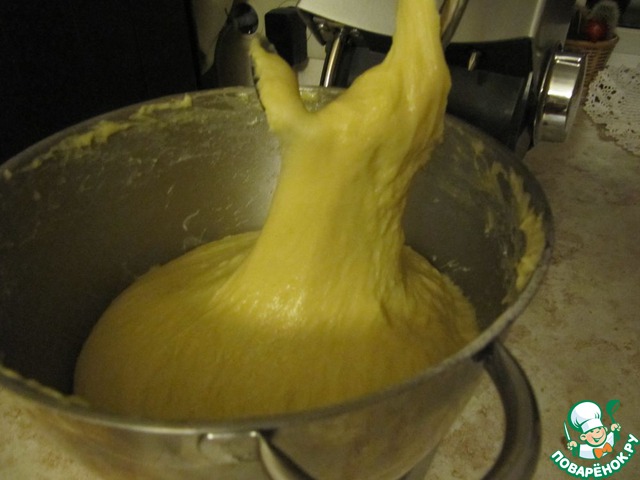 Тесто через 10 мин. от начала замеса начинает собираться в гладкий шелковистый колобок, потом оно трансформируется как бы в каплю (еще около 10 мин.), а в конце замеса полностью отстает от стенок чаши и издает хлопающие о стенку звуки! Тесто готово к дальнейшему процессу! Важно вымесить тесто очень хорошо, не менее 20-25 минут!