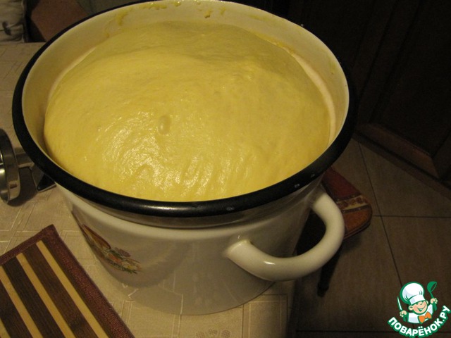 Готовое тесто выкладываем в большую кастрюлю. Тесто через 1,5 часа подъема: