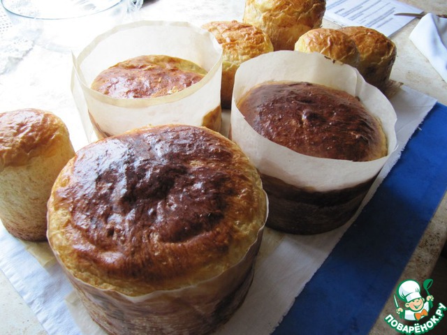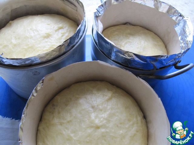 Формы смазываю сливочным маслом, выстилаю дно и бока бумагой для выпечки, если форма низкая, то наращиваю фольгой с бумагой! Выкладываю тесто на 1/3 от высоты формы, если вы хотите сверху шапочку, то кладите побольше! ставим в теплое место на расстойку до увеличения как минимум в 2 раза.