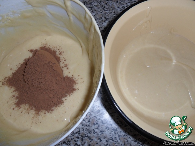 Полученное тесто разделить на 2 части. В одну добавить какао и хорошо перемешать.