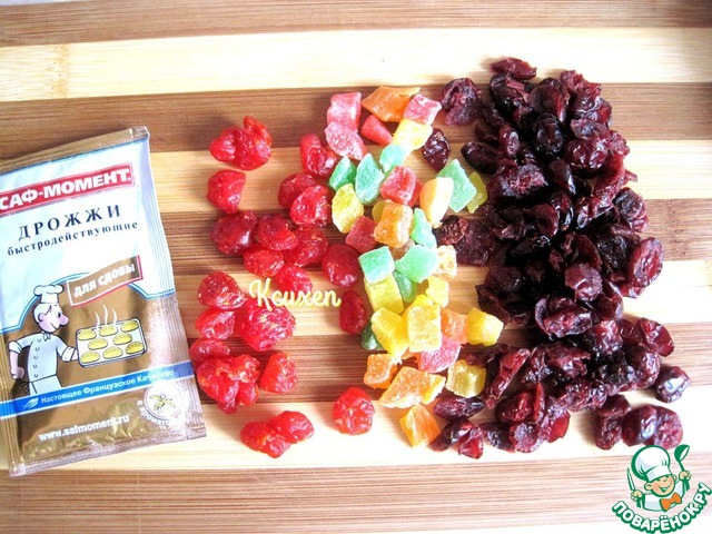 Подготовим ягоды и цукаты. Вишня у меня была крупной- я её порезала, цукаты так же порезала, клюкву оставила как есть. На самом деле сухофрукты и цукаты можно брать любые по вкусу, в любых пропорциях, главное, что б общий вес сухофруктов был 85 грамм ( для данного количества муки)!