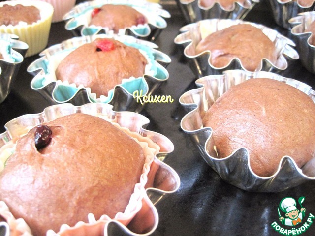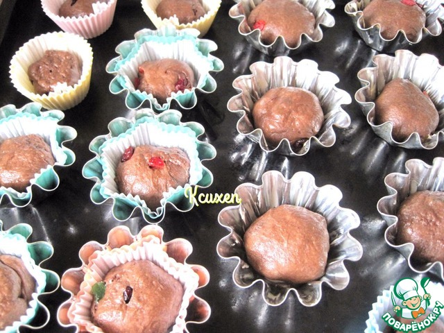 Формочки для выпечки смажем сливочным маслом (либо вложим бумажные капсулы). Из теста сформуем небольшие шарики, выложим шарики в формочки. Тесто в формочке должно занимать не более 2/3 объёма. Накроем и оставим в тёплом месте для подъёма. Духовку разогреваем t 100 градусов (это не ошибка!)