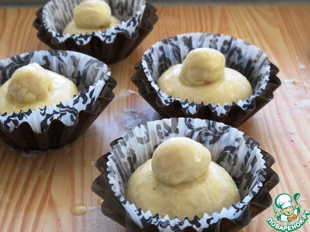 ... и скатать его в шарик. Положить в формочку. Сверху вставить маленький шарик из теста для украшения. Смазать яйцом, поставить в духовку при 50 градусах на 25 минут для подъёма. Затем добавить жар до 160° и допечь до готовности.